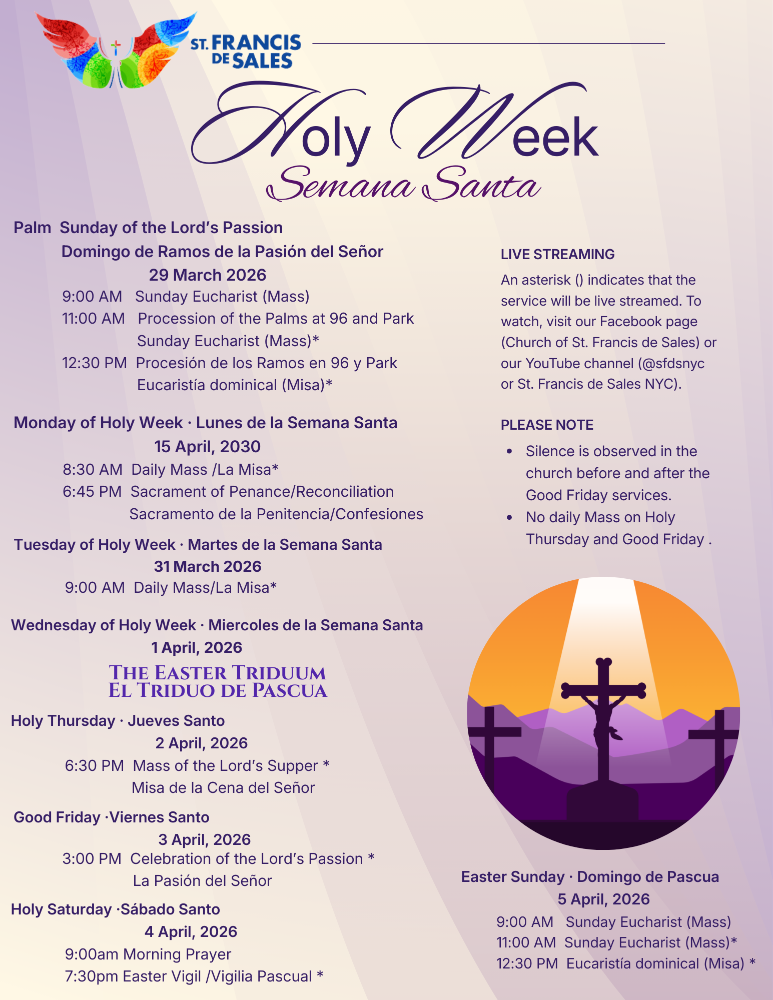 Our 11am & 12:30pm Sunday Masses, weekday Masses, and are live streamed. To view, visit our SFDS Youtube channel.